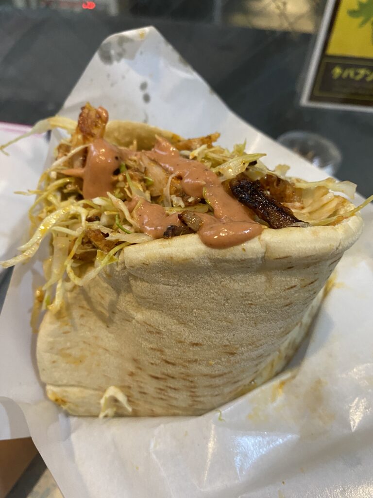 秋葉原のモーゼスさんのケバブ.ここの注目メニューがビッグケバブ.普通のケバブサンドは円形のピタパンを半分に切ったものを使用されてるが,このビッグケバブはピタパン1枚をまるまる使っている.写真では良くわからないかもしれないが,中央に切れ線が残っているのが分かると思います.円形の上側を切って,そこからケバブが詰められています.なかなかクレイジーなケバブです.通常のケバブサンドが500円で,このビッグケバブが900円.中身は体感では2倍以上になっているような気もしますが,気のせいかもしれませんw ケバブは圧倒的なボリュームで食べるのが美味いので,至福を味わえるケバブです.