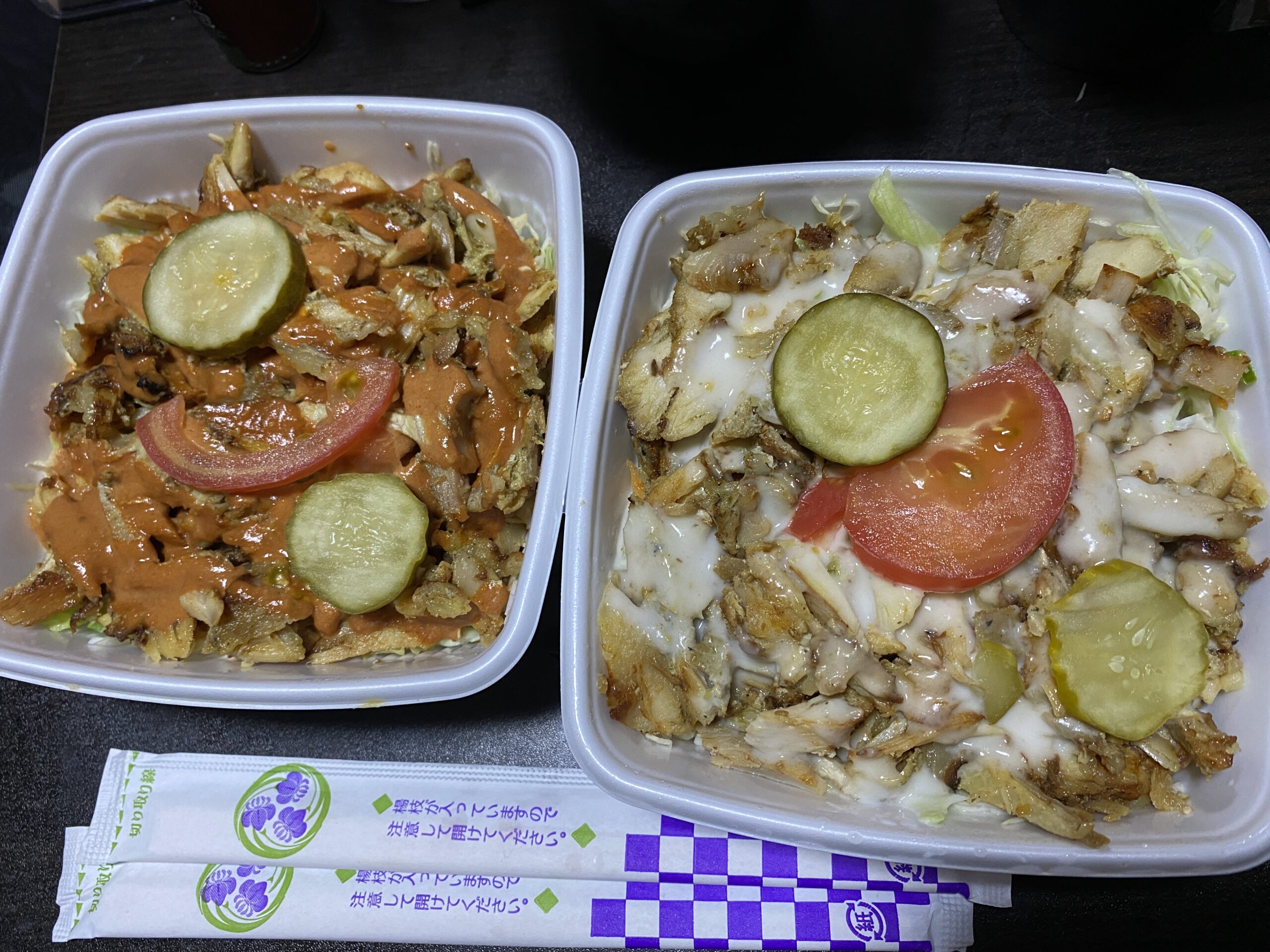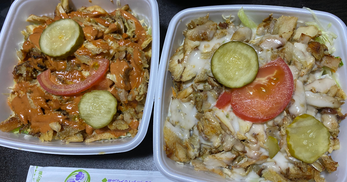 市川市行徳のKEBAB CENTER.行徳エリアのケバブ屋のなかで,頭一つ抜け出ているのが,ここKEBAB CENTER.駅からはやや遠いのが難点だが,来るだけの価値はある.この日は,ケバブ丼2個を持ち帰りで.チリソースとガーリックソース.大き目に輪切りされたピクルスがとても嬉しい.