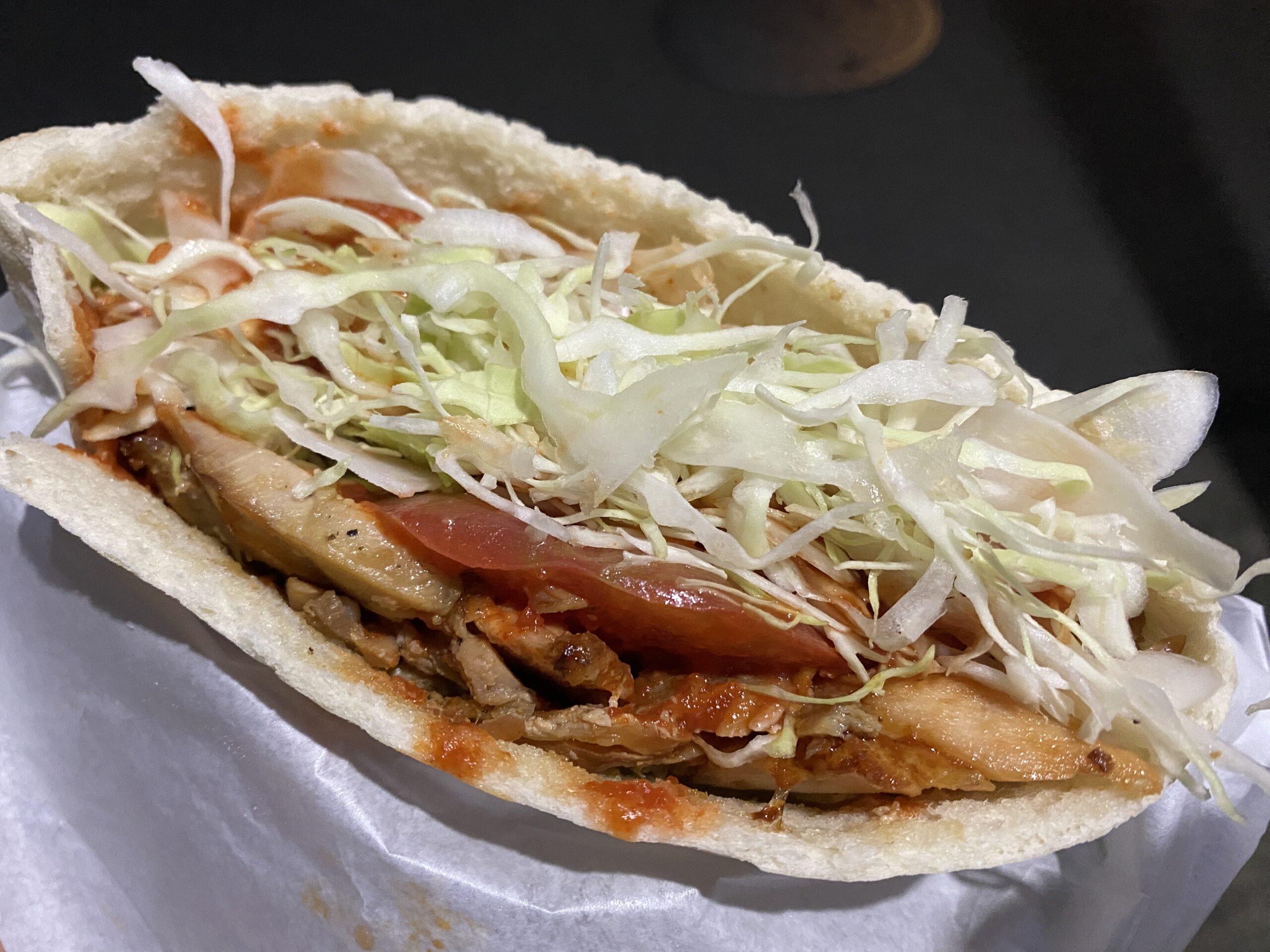 新松戸のKIYAN KEBAB.めっちゃ高級感!ピタパンへの詰め方は,珍しい縦割りタイプ.持ち帰り用で一旦封を閉じてしまった後だが,それでもすごく綺麗にびっしり詰め込まれている.縦割りタイプは,積層タイプに比べて,食べるときに口の周りが汚れにくくて良い.KIYAN KEBABはとにかく美しい!
