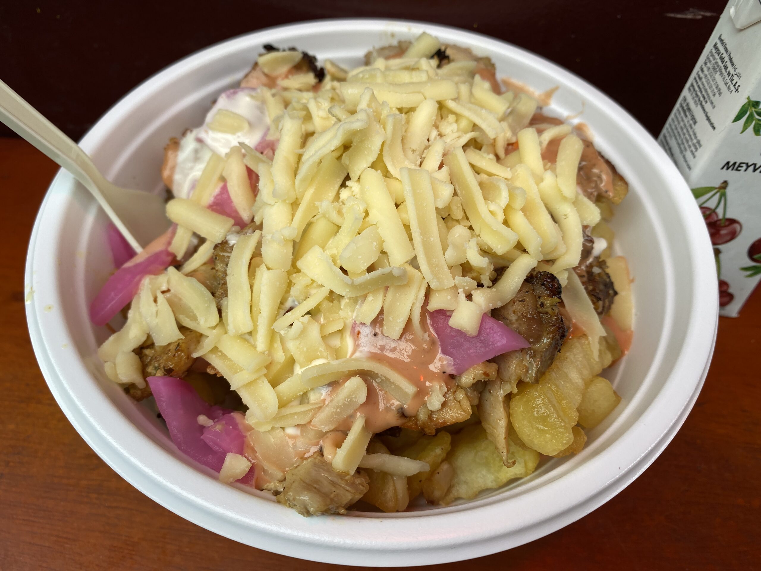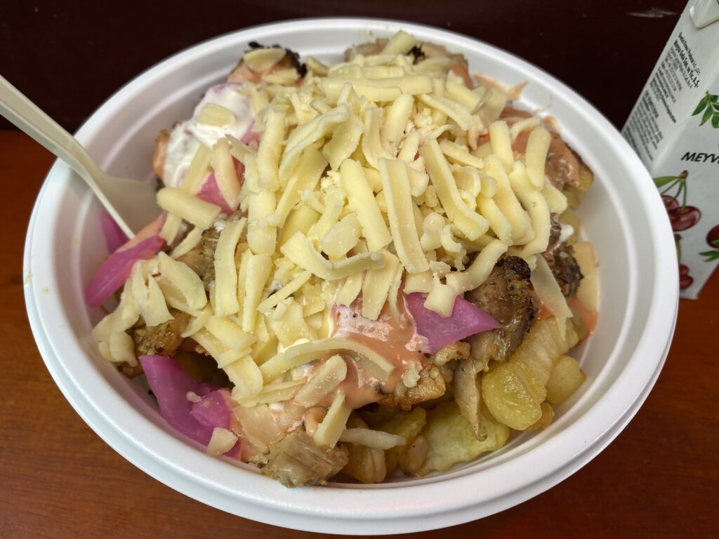 そしてこの日は,ポテト丼を.ポテト丼とは,米の代わりにフライドポテトが詰められていて,丼状態になっているもの.ポテト好きにはたまらないメニュー.ケバブは勿論,チーズも加わり物凄いパンチ力だ!Mサイズでだいぶグロッキーになったので,Lサイズは危険すぎる.要注意.