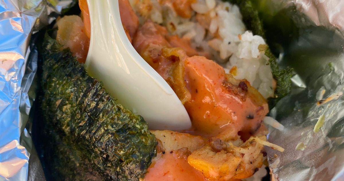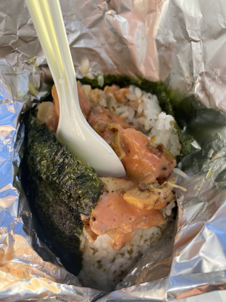 実食してみると,めちゃくちゃ美味い!あまりにケバブと米が多いので,比率的に海苔はほんのり感じる程度.だって,具と米が多すぎて,海苔が一周巻ききれてないんだからw