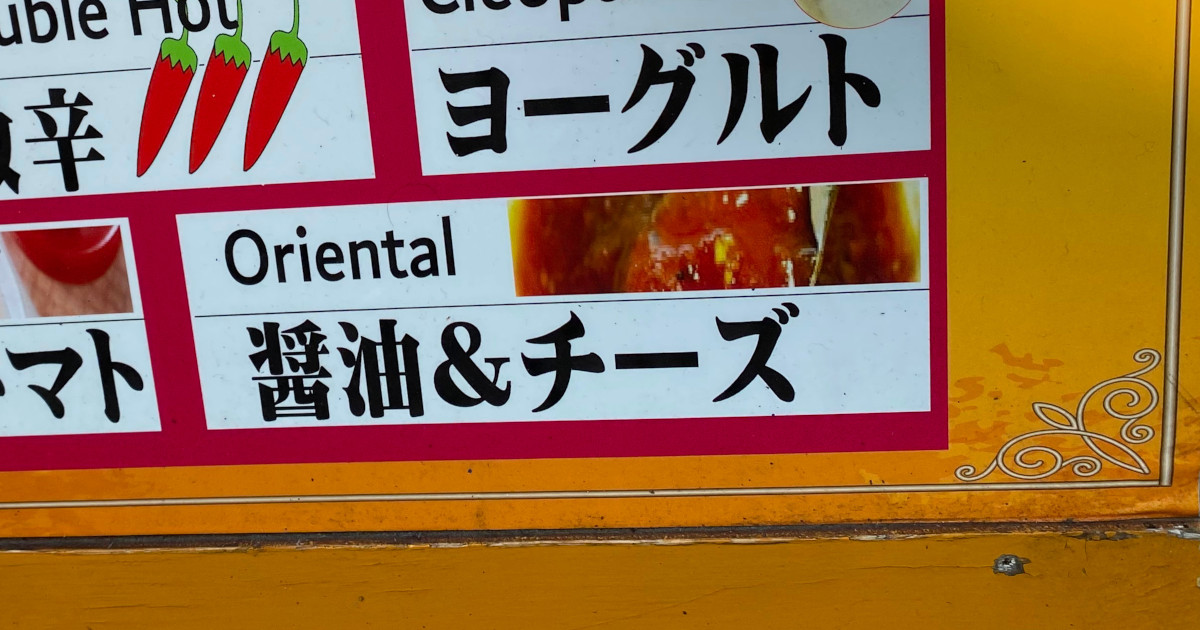 錦糸町のスマイルケバブ.今年,各ケバブ屋が50円程度の値上げをしたが,ここは変わらず300円で日本最安値を維持してる.2回目の今回は,以前から気になっていた醤油&チーズというOrientalソースを試してみることに.ちなみに,ヨーグルトソースをクレオパトラ,ヨーグルト&トマトをアレキサンダーとのネーミングで面白い.