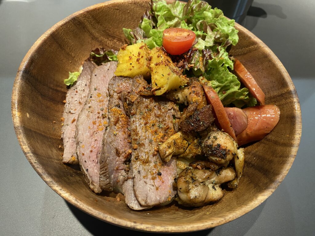 写真では麺が隠れてしまっていますが,肉の下にまぜそばがあります.右はケバブ丼です.ドネルケバブを削いだ後,さらに炭火焼きしていたので,肉そのものの味がしっかり出てるケバブでした.