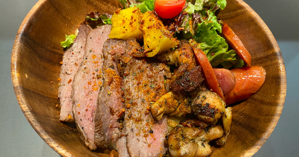 写真では麺が隠れてしまっていますが,肉の下にまぜそばがあります.右はケバブ丼です.ドネルケバブを削いだ後,さらに炭火焼きしていたので,肉そのものの味がしっかり出てるケバブでした.